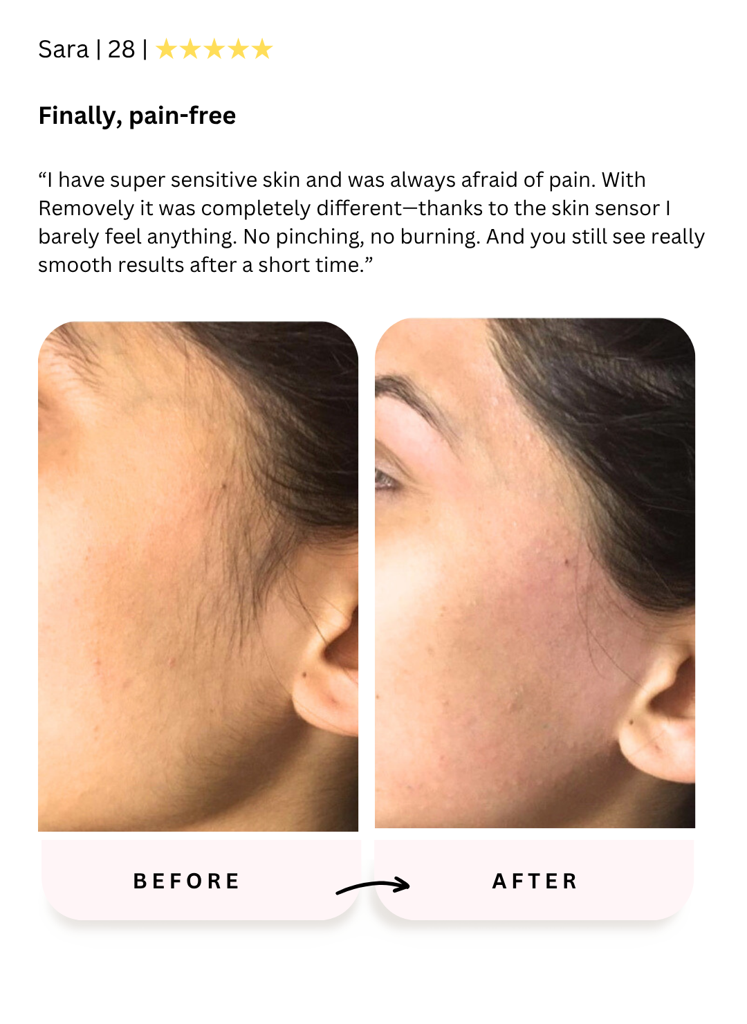 Removely’s intelligent skin sensor analyzes your skin and automatically adjusts the intensity for each area of the body. This makes treatment with Removely much more effective than many other IPL devices and it does not hurt. Face, underarms, and bikini area can be treated without pain.