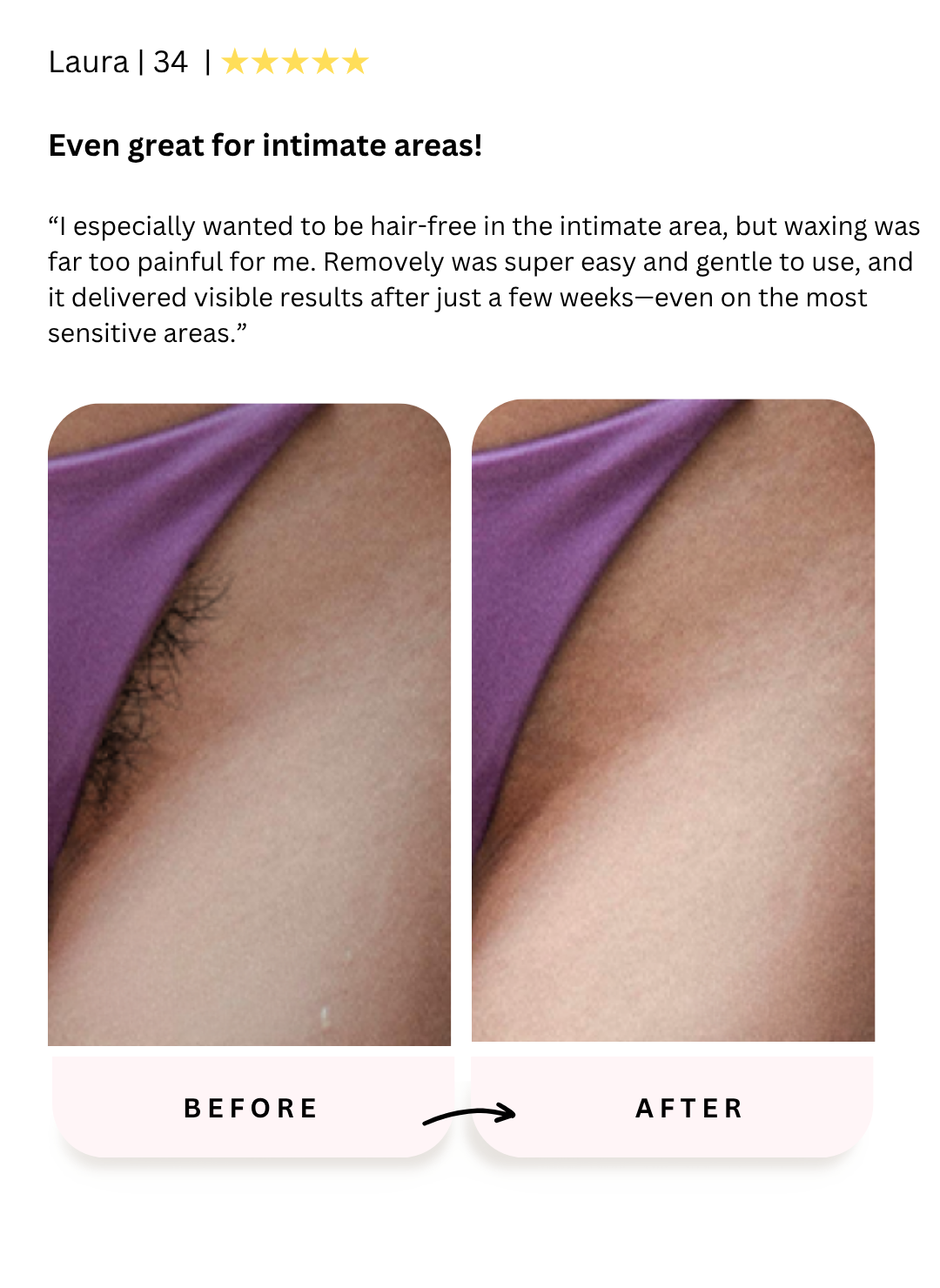 With Removely, that’s over: long-lasting, visible hair-free results in just a few weeks. Effective hair removal like a laser studio, thanks to cutting-edge 2025 IPL technology. Clinically certified, and trusted by over 50,000 women.