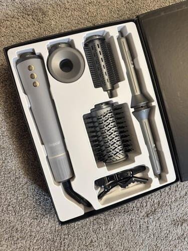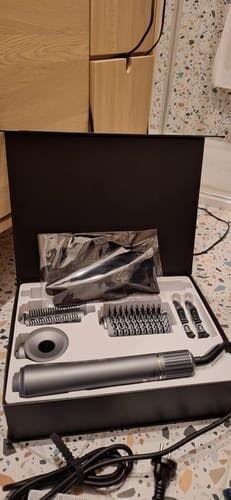 Ein Hochgeschwindigkeits Haartrockner, zwei Lockenaufsätze, ein volumisierender Kamm, eine Rundbürste und eine Aufbewahrungstasche.