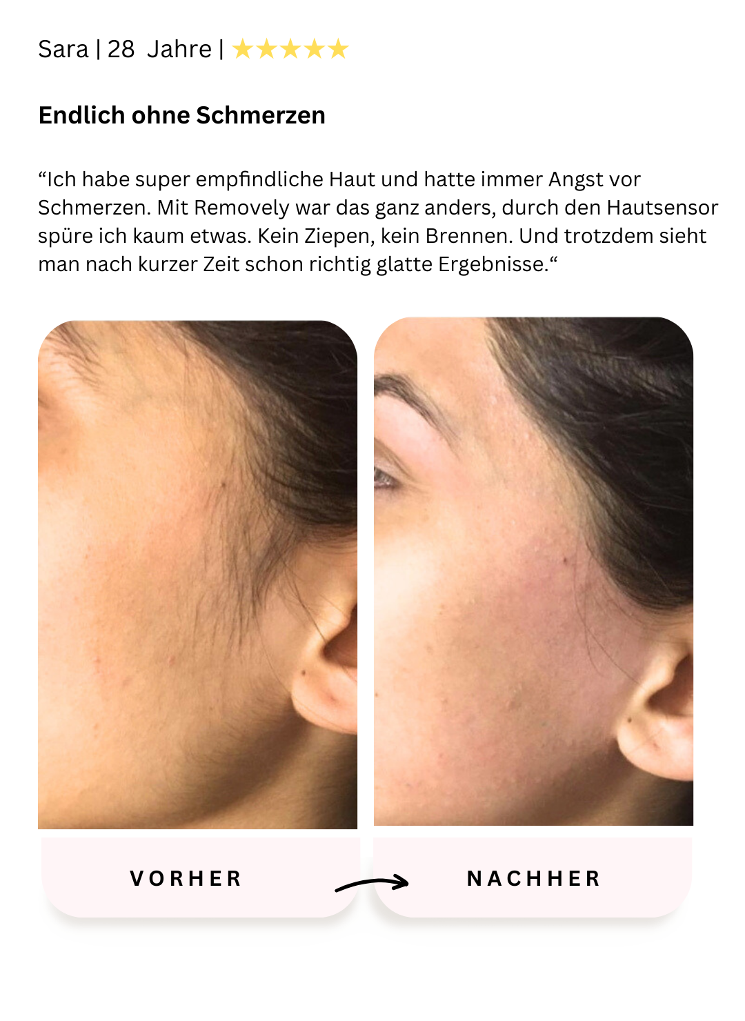 Eine einzige Laserstudio-Sitzung kostet oft mehr als unser IPL-Gerät. Mit dem Removely IPL 3+ (Try & Buy) investierst du einmalig in eine professionelle Haarentfernungslösung, die dir jahrelang erhalten bleibt, ohne wiederkehrende Kosten.